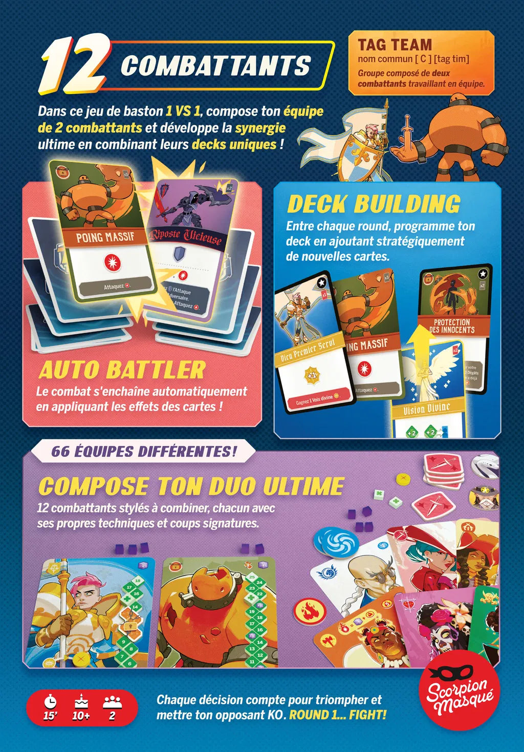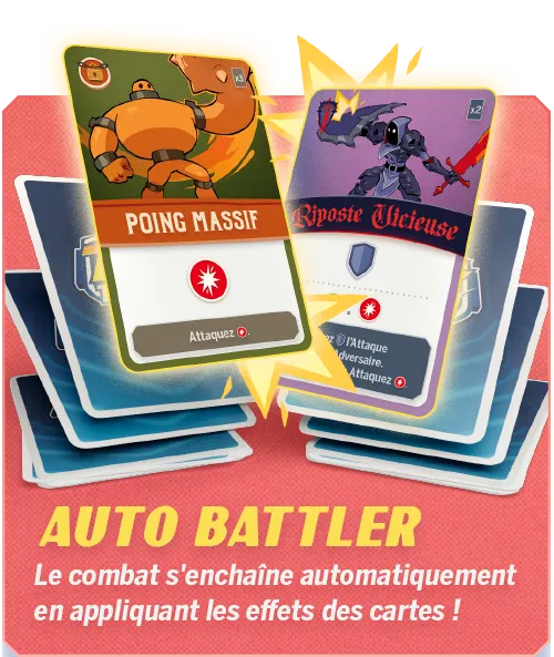 Composez votre duo ultime de combattants et développez la synergie ultime combinant leurs 2 decks uniques !Commencez avec un deck de 2 cartes seulement. Le combat se déroule automatiquement ; dépilez vos cartes en appliquant leurs effets. Chaque fin de round est capitale ! Programmez votre deck en y ajoutant stratégiquement (entre chaque round) de nouvelles cartes sans modifier l’ordre de celles qui s’y trouvent déjà afin de planifier un assaut décisif !Maîtrisez votre équipe, créez des combos dévastateurs et dominez votre adversaire en déjouant habilement ses attaques. Chaque décision compte pour triompher et mettre votre opposant KO !