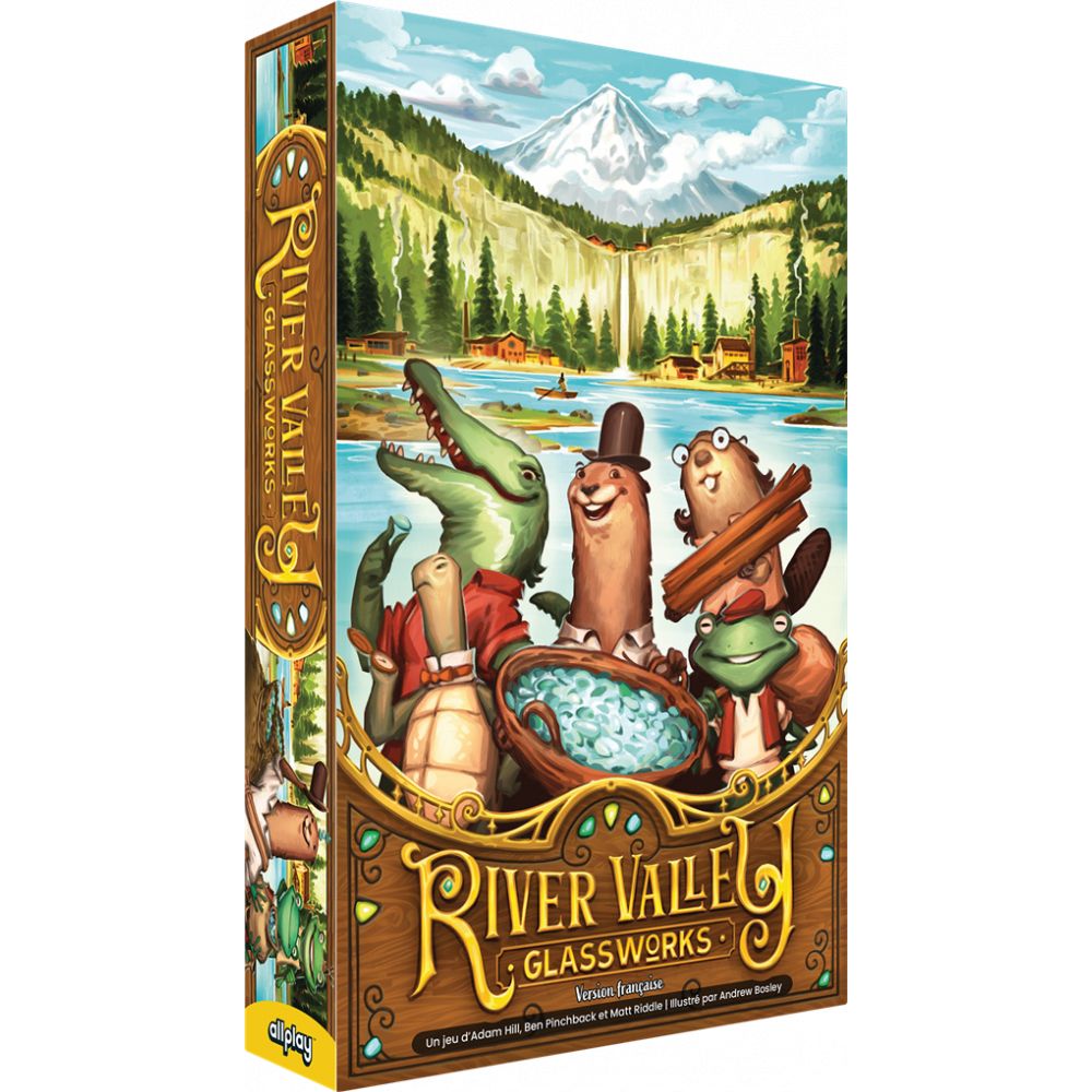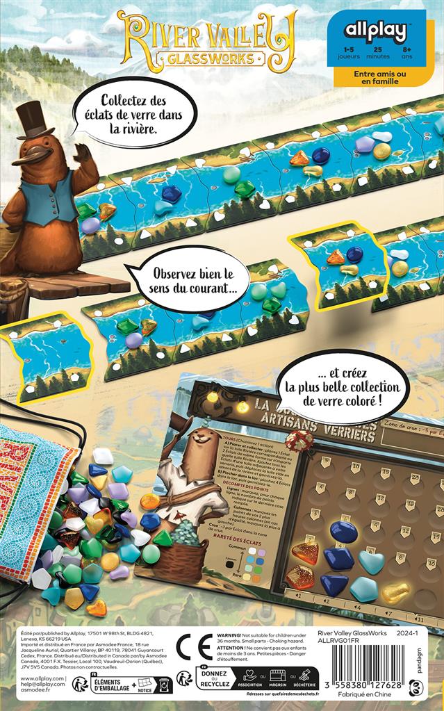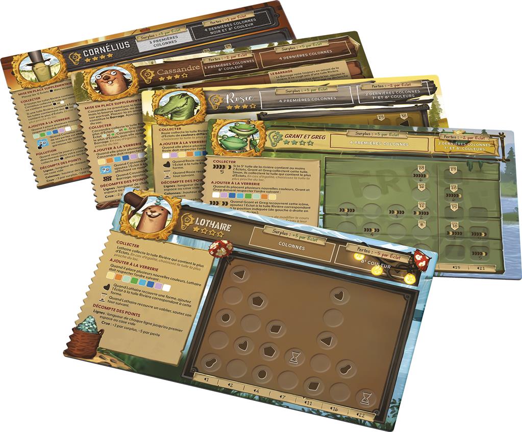 Bienvenue sur les berges de la rivière ! Les magnifiques éclats de verre parsemant le lit du cours d’eau attirent les créatures les plus ambitieuses de la forêt. Faites prospérer votre verrerie !Votre objectif est de remplir votre verrerie en y plaçant au mieux des Éclats de verre collectés dans la rivière. À chaque tour de jeu, placez un des éclats de votre bourse vers une tuile rivière (en respectant les impératifs de forme), puis ramassez les éclats d’une tuile adjacente, ou bien remplissez votre bourse en prenant 4 des 5 éclats présents dans le lac. Prenez garde à ne pas trop en ramasser au risque d’être victime de crue, ce qui vous couterait des points en fin de partie.Rangez les éclats prélevés dans votre verrerie, en respectant cette fois les couleurs, chaque colonne ne peut recevoir des éclats que d’une seule couleur. Faites ensuite le total des points en fonction du remplissage des lignes (sans trou) et des deux plus hautes colonnes de votre verrerie. Le joueur ayant le plus de points est le vainqueur et l’on pourra admirer sa superbe verrerie, pleine d’éclats colorés.