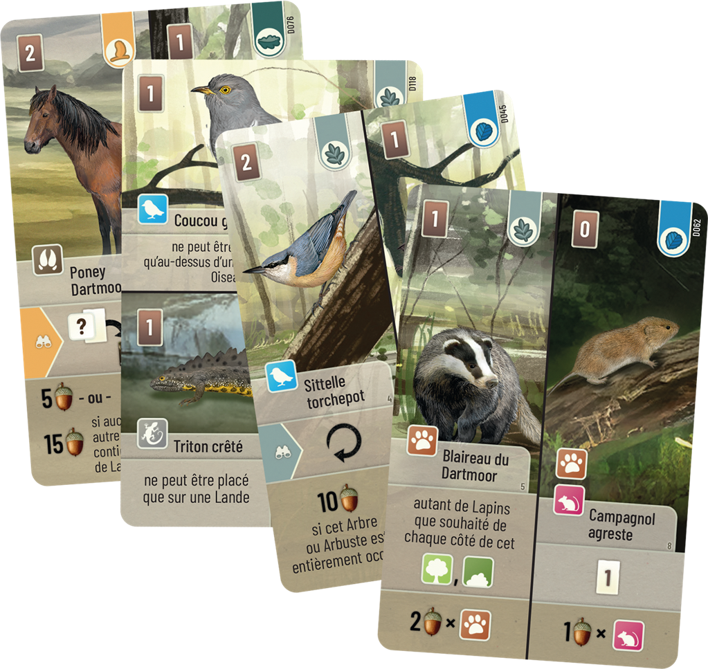 Forêt Mixte : Dartmoor vous fait voyager dans les collines brumeuses du sud-ouest de l’Angleterre pour créer un écosystème riche et harmonieux. Dans ce jeu de cartes stratégique, composez votre forêt en y ajoutant arbres, terrains et espèces locales, en respectant leurs besoins spécifiques et leurs préférences d’habitat. Chaque carte est une pièce du puzzle vivant que vous allez composer : certains animaux ont besoin d’un type de terrain spécifique (lande, rivière…), d’autres préfèrent être seuls ou entourés de leurs congénères. Mettez en place des synergies à effet immédiat ou persistant, profitez des bonus conditionnels et de la gestion de la clairière commune. Les cartes divisées en deux permettent un large éventail de choix. Avec ses 180 cartes finement illustrées, son matériel sans plastique et ses règles accessibles, Forêt Mixte : Dartmoor séduit les familles comme les amateurs de nature et de réflexion. Il s’agit d’un jeu indépendant de la gamme Forêt Mixte, idéal pour découvrir ou prolonger l’expérience.