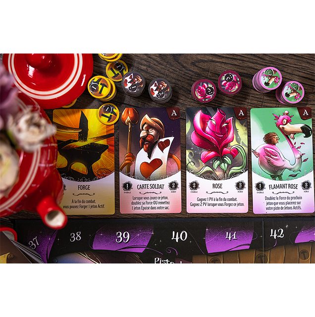 LE JEU : Chaque joueur incarne un habitant du Pays des Merveilles et mène une Faction à la guerre. Le jeu se déroule en 3 rounds, composés d’une phase de Thé et d’une phase de Guerre. Pendant la phase de Thé, les personnages se préparent au combat. Vous placerez des Partisans dans diverses Régions du Pays des Merveilles afin de vous y établir, d’y recruter des Alliés et d’y trouver des Forges magiques qui permettront de débloquer les capacités uniques de votre Faction. Pendant la phase de Guerre, les personnages partent au combat. Vous piocherez alors des pions Alliés dans votre sac pour utiliser leur Force. Le joueur ayant la Force la plus élevée remportera la bataille, obtiendra des récompenses de conquête et construira un Château dans cette Région. Les joueurs gagnent des soutiens en construisant des Châteaux, en accomplissant des Quêtes et en collectionnant des points de Victoire. À la fin du troisième round, celui qui a le plus de points l’emporte.